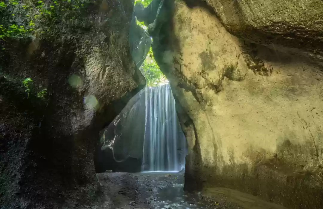 Tukad Cepung Waterfall is a hidden gem in Bali, famous for its stunning light rays filtering through the cave opening above. The waterfall cascades into a serene pool, surrounded by towering cliffs and lush greenery, creating a magical, otherworldly atmosphere.